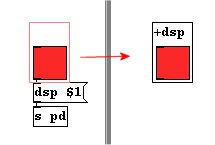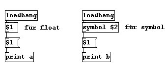 Zweierlei gilt es zu beachten: Man kann den Inhalt einer Abstraktion vom Mainpatch aus sehen und verändern (einfach im Mainpatch auf das Objekt klicken). Die Veränderung darin wird aber nicht gespeichert! Nur wenn man die Datei der Abstraktion selbst als normalen Patch in Pd öffnet, kann man ihn auch ändern und speichern. Außerdem können in einer Abstraktion die $-Variablen nur in Objekten geschrieben werden. In Message-Boxen bezeichnet $1, wie sonst auch, nur einen Input in die Message-Box (siehe 2.2.2.1.4). Wir helfen uns beispielsweise so: