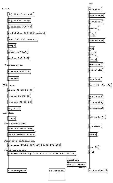 Wir haben einen Patch mit einem Subpatch namens „test“. Im Hauptpatch senden wir diesem Subpatch durch „s pd-test“ nun folgende Messages, in der Reihenfolge von oben nach unten: