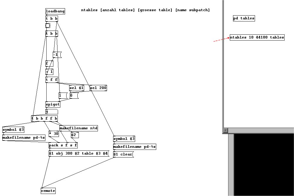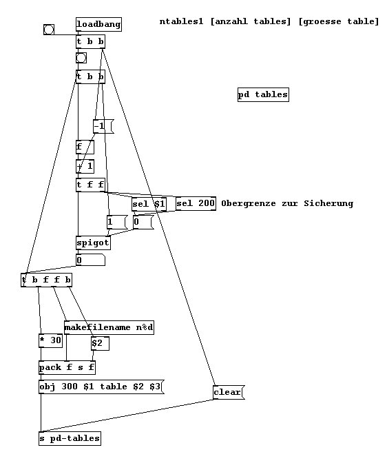 Nun können wir – wenn auch auf etwas komplizierte Weise – beispielsweise eine bestimmte Anzahl von Arrays mit einer Abstraktion erzeugen, was anders in Pd nicht zu realisieren ist (vgl. 3.2.3.1):